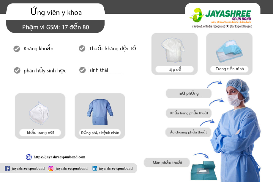 Jayashree spun bond đóng một vai trò quan trọng trong lĩnh vực ứng dụng y tế bằng cách cung cấp các sản phẩm vải không dệt được sử dụng rộng rãi và đảm bảo bảo vệ và ngăn ngừa nhiễm trùng và bệnh tật.